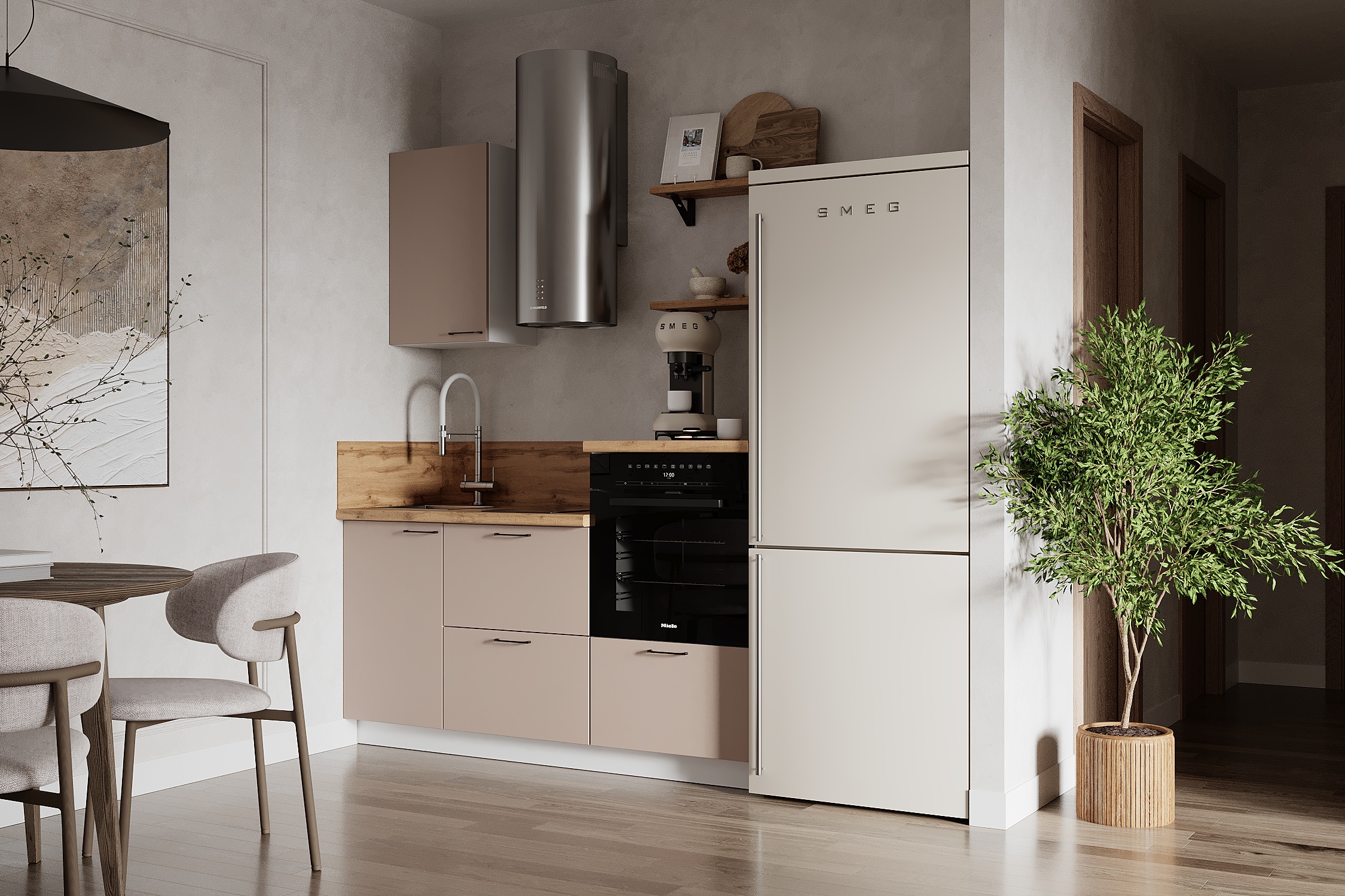 — Эстетика и зонирование: высокий модуль для духового шкафа делает интерьер аккуратным и современным.