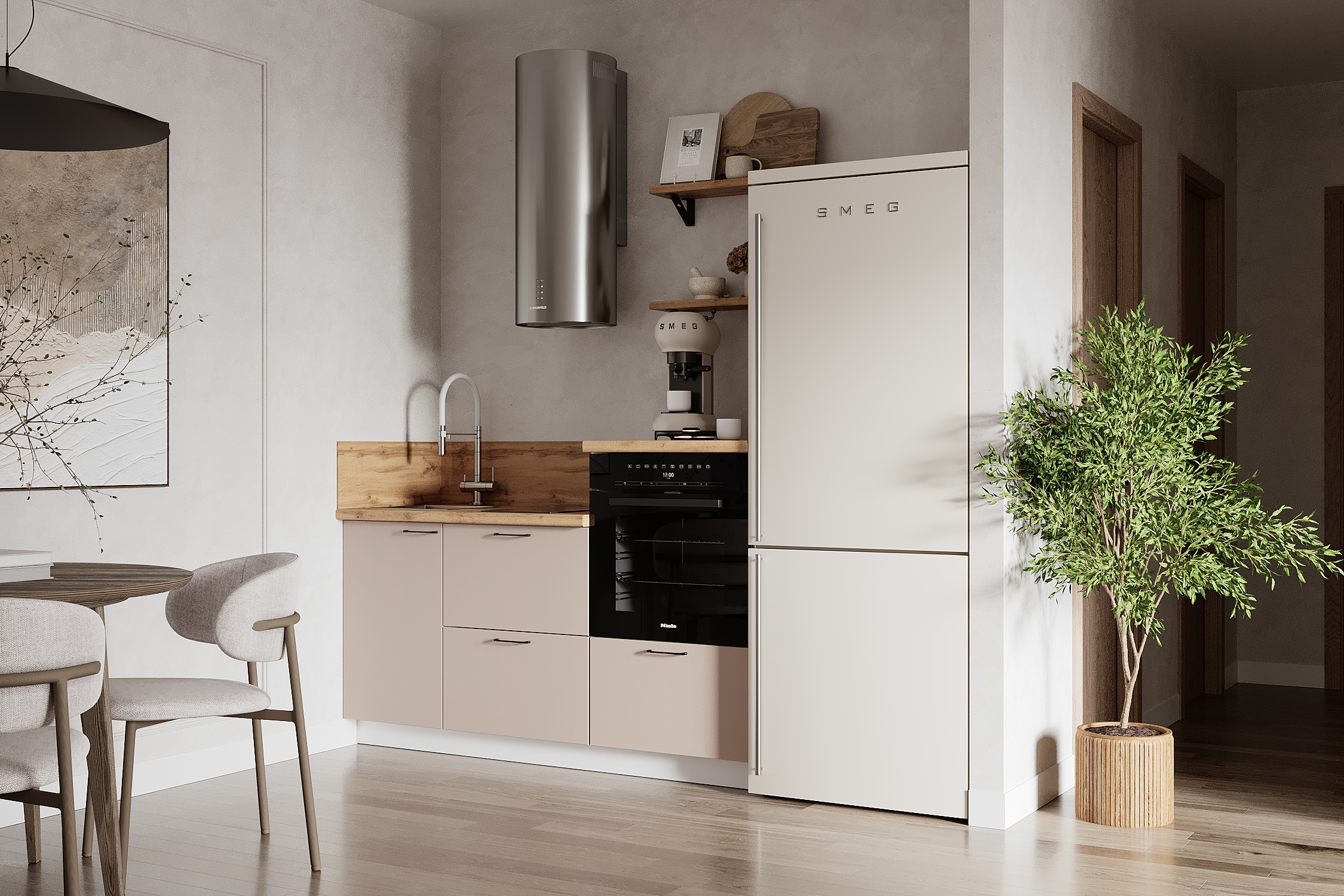 — Эстетика и зонирование: высокий модуль для духового шкафа делает интерьер аккуратным и современным.